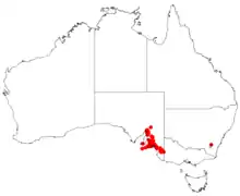 This hakea has a scattered distribution in southern parts of the Flinders Range and the Mount Lofty Ranges. A couple of isolated populations are also found in the southeast of the state around Padthaway. The species is often part of the understorey of dry sclerophyll forest and is also found among scrub-heath communities growing in sandy to loamy soils.[2][3]