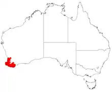 The shrub is found in southern areas of Western Australia in the Peel, South West and Great Southern regions of Western Australia where it grows on seasonally damp flats and among granite outcrops in sandy, loamy or gravelly soils.[2] The plants range is from near Perth in the north and south to around Albany and inland to around the Stirling Range area where it grows in heath or Melaleuca woodland communities.[4]