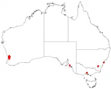 The snail hakea is specifically associated with lateritic soils and granite outcrops in the jarrah forests of the Darling Scarp between Chittering and Mundaring.[2] It is usually part of open Eucalyptus wandoo woodland communities.[3]