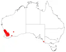 This species grows from Eneabba through the central wheatbelt region of Western Australia south to Dumbleyung on sand, loam, clay and lateritic gravel in heath and scrubland. This species grows best in full sun where drainage is good. It is frost tolerant and moderately drought resistant. A good bird habitat due to its dense and prickly growth.[2][3]
