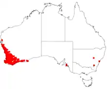 A variable and common species, widespread from coast of Northampton to Israelite Bay.[5] Grows in heath or woodland on sand, loam, lateritic gravel or limestone. Requires a sunny or semi-shaded aspect with good drainage. May be used for hedging and wildlife habit and is drought and frost tolerant.[4]