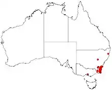 The range is the south coast and southern tablelands of New South Wales to altitudes of 1,060 metres (3,480 ft).[4] A population from Dorrigo in northern New South Wales has since been classified as a separate species H. ochroptera.[5] Hakea macraeana is an understory plant of sclerophyll forest on rocky soils.[4] The species' response to bushfire is unknown.[4]