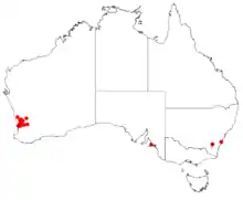 A restricted species growing near Perth with intermittent occurrences north to Victoria Plains, it grows in lateritic sandy clay, granite outcrops and wandoo woodlands. It is an ornamental garden plant good for rockeries and as a ground cover in a well-drained, open, sunny site.[3][6]