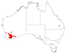 This species is found growing in low heath on sand, sometimes over laterite from Tammin in the central wheatbelt, ranging south to Bremer Bay and Esperance.[3][5]