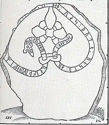 This runestone is also called the Bro Runestone after the church by which it is located. It is raised by the same aristocratic family as the Ramsund carving and the Kjula Runestone, which allows scholars to study the family of the Hakon Jarl who is mentioned on this runestone.[3] He is considered to have been Swedish and his son Özurr may have been responsible for organizing the local defense organization against raiders on the shores of lake Mälaren.[3] However, the only recorded organization of such a defence is from England and consequently both this Hakon Jarl and his son Özurr may have been active in England in the Þingalið instead.[5] Omeljan Pritsak argues that this Hakon is the same as the one who is mentioned on the Södra Betby Runestone and whose son Ulf was in the west, i.e. in England.[7] This Swedish Hakon Jarl would then actually be the Norwegian Hákon Eiríksson.[7]
