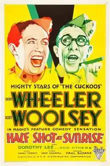 Half Shot at Sunrise is a 1930 American comedy film starring the comedy duo Wheeler & Woolsey and Dorothy Lee. Their fourth film together, it was the second starring vehicle for the two, following the success of The Cuckoos, which had been released earlier in 1930. Directed by Paul Sloane, from a screenplay by Anne Caldwell, James Ashmore Creelman, Ralph Spence, and Fatty Arbuckle, which had been tailored to highlight the comedic talents of Wheeler and Woolsey. In 1958, the film entered the public domain in the United States because the claimants did not renew its copyright registration in the 28th year after publication.[3]