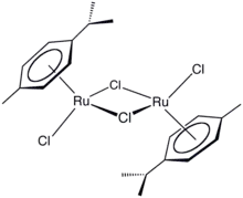 Half-sandwich compounds employing Ru(II), such as (cymene)ruthenium dichloride dimer, have been mainly investigated as catalysts for transfer hydrogenation.[20] These complexes feature three coordination sites that are susceptible to substitution, while the arene ligand is tightly bonded and protects the metal against oxidation to Ru(III). They are prepared by reaction of RuCl3·x(H2O) with 1,3-cyclohexadienes.[21] Work is also conducted on their potential as anticancer drugs.[22]