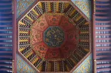 Inside the main hall’s central bay, the domed coffered ceilings exhibited traditional patterns like dragons and golden decorations (douba-zaojing), reflective of the architectural and artistic style that pervaded the Ming Dynasty.[1] A product of Confucianism, a zaojing, (Chinese: 藻井; pinyin: zǎojǐng) or coffered ceiling, is shaped in either a square, octagon or circle, and is placed in the centre of the ceiling.[24] It was a common feature in ancient Chinese halls, palaces, religious temples, and physically represented the “unity of heaven and man on the one hand, and a hierarchical society on the other.”[24]