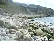 Tar Rocks are located near the bay. They are the relics of an ancient landslide, with the majority often hidden at high tide.[7] The British cargo steamer SS Thames was wrecked at Tar Rocks in 1891, after being driven ashore in fog.[8][9] In 1930, SS Barmston, a collier, was also wrecked at the site and became a total loss.[10]