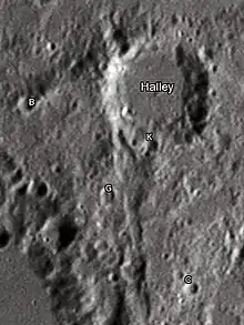 Halley is a lunar impact crater that is intruding into the southern wall of the walled plain Hipparchus. Its diameter is 35 km. The crater is named after the English astronomer Edmond Halley.[1] On the 1645 map by Michael van Langren, the crater is called Gansii, for the gansa (a kind of wild swan) of Francis Godwin's The Man in the Moone.[2] To the southwest of Halley is the large crater Albategnius, and due east lies the slightly smaller Hind.