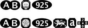These are shown in the top of the two example hallmarks. The bottom example shows the extra marks that can also be struck, the lion passant, indicating Sterling silver, the date mark (lowercase a for the year 2000), and in this example, the 'Millennium mark', which was only available for the years 1999 and 2000. The bottom example bears the Yorkshire rose mark for the Sheffield Assay Office.[15]