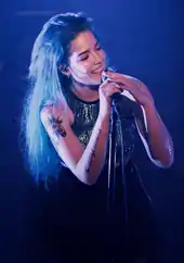 In her early career, Halsey drew criticism for allegedly calling herself "tri-bi" in an interview, due to her being biracial, bipolar, and bisexual. In a 2016 interview with Rolling Stone, she criticized the label as a trivializing way to describe her.[179] Halsey became most known for her signature dyed blue hair in her early career.[180] She sparked controversy in 2016 after several fan interactions, some involving the artist kissing underage fans.[181]