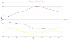 Halton is considered a safe seat for the Labour Party. Its most marginal election result, a 12.8% majority, was the earliest in 1983, the year of Margaret Thatcher's first landslide victory, — three elections later that majority had risen to 53.2% of the vote. It has otherwise, to date, proven a statistical safe seat for the Labour Party's incumbent MPs, of which there have thus far been two. The 2015 result made the seat the 22nd safest of Labour's 232 seats by percentage of majority.[7]
