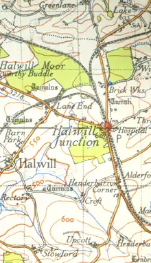A third route stretching out to the north towards Torrington was opened on 27 July 1925 by the North Devon and Cornwall Junction Light Railway.[4] This was served by a separate uncovered platform outside the main station building, situated to the north. The station now became officially known as Halwill, although its running-in board provided a fuller description of the routes available, proudly announcing Halwill for Beaworthy, junction for the Bude, North Cornwall & Torrington Lines.[3]