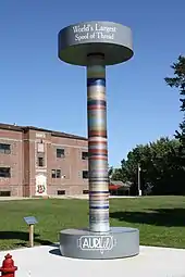 The active quilt business has inspired the construction of The World's Largest Spool of Thread. At 22 feet tall and 8 feet wide, the spool was unveiled in September 2019, containing 1 million yards of Aurifil thread. Located at 300 East Bird in Hamilton the spool rests on the corner of the Missouri Quilt Museum.[26][27][28]