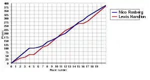 The season long title battle between the two was decided in the final race of the season in Abu Dhabi, where teams and drivers scored double the number of points awarded for race finish positions for the first time in the history of Formula One.[42] Hamilton had a perfect start, passing Rosberg before turn 1 to take the lead before going on to win to secure his second World Championship title. Rosberg ultimately finished down in 14th, as problems with the ERS system on his car significantly reduced his pace. Despite advice over the radio to retire the car, Rosberg said he would like to go to the end and finish the race, which he ultimately did.[43] Ahead of the podium ceremony, Rosberg entered into the cooldown room to congratulate Hamilton on winning the title. Hamilton later paid tribute to Rosberg for his graciousness in defeat.[44] Hamilton finished the season with 384 points, recording 11 wins and 7 pole positions ahead of Rosberg who finished with 317 points, recording 5 wins and 11 pole positions.[45]