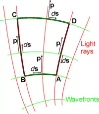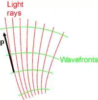 Since p is a vector tangent to the light rays, surfaces S=Constant must be perpendicular to those light rays. These surfaces are called wavefronts. Figure "rays and wavefronts" illustrates this relationship. Also shown is optical momentum p, tangent to a light ray and perpendicular to the wavefront.