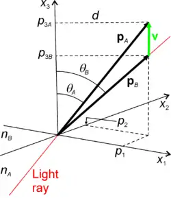 In figure "refraction", the normal to the refractive surface points in the direction of axis x3, and also of vector . A unit normal to the refractive surface can then be obtained from the momenta of the incoming and outgoing rays by