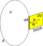 Figure "volume variation" shows a volume V bound by an area A. Over time, if the boundary A moves, the volume of V may vary. In particular, an infinitesimal area dA with outward pointing unit normal n moves with a velocity v.