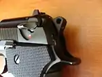 The hammer is a part of a firearm that is used to strike the percussion cap/primer, or a separate firing pin,[1] to ignite the propellant and fire the projectile. It is so called due to the fact that it resembles a hammer in both form and function. The hammer itself is a metal piece that forcefully rotates about a pivot point.[2]