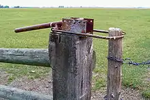 A Hampshire gate occupies a gateway in a fence similar to that used for a conventional gate. However, instead of a rigid gate, a short section of loose wire fence fits into the gap – this may consist of wire netting or barbed wire, and it usually matches the adjacent fence. One end of the wire is attached permanently to the main fence, and two or more short posts or battens keep it upright and flat – one of these is at the loose end. When the "gate" is closed, this end post fits into a loop of wire at the base of the fixed fence, and the top is then pulled tight to tension it. The top of the post may be held by another loop of wire, or additional tension may be provided by a length of chain looped around the post and hooked onto a nail. Proprietary closures are also available which give still greater tension, usually by means of an over-centre mechanism (see photo below).