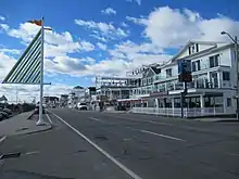 The heaviest development lies south of the Ashworth-by-the-Sea hotel, located at the eastern terminus of NH 101 where it meets NH 1A, known locally as Ocean Boulevard. From this point south, NH 1A splits into two one-way streets: the southbound Ashworth Avenue, and the northbound Ocean Boulevard. Cross streets through this area run from A Street in the north to M Street in the south. The southern end of the spit is mostly state park, with little to no buildings or development. North of the junction of 101 and 1A, the area is much less developed, dominated mostly by a large salt marsh conservation area, with small businesses and bungalows along Ocean Boulevard (NH 1A). North of Winnacunnet Road (and outside the CDP), a second area of heavier development begins with Kings Highway parallel to Ocean Boulevard, and cross streets numbered from 1st Street in the south to 19th Street in the north. The resort ends at the Windjammer Hotel at its northern end, at the junction of NH 27 and NH 1A.