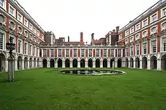 In the following century, King William III's massive rebuilding and expansion work, which was intended to rival the Palace of Versailles, destroyed much of the Tudor palace.[3] His work ceased in 1694, leaving the palace in two distinct contrasting architectural styles, domestic Tudor and Baroque. While the palace's styles are an accident of fate, a unity exists due to the use of pink bricks and a symmetrical, if vague, balancing of successive low wings.[4] King George II was the last monarch to reside in the palace.