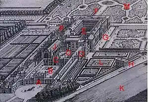 The grounds as they appear today were laid out in grand style in the late 17th century. There are no authentic remains of Henry VIII's gardens, merely a small knot garden, planted in 1924, which hints at the gardens' 16th-century appearance.[39] Today, the dominating feature of the grounds is the great landscaping scheme constructed for Sir Christopher Wren's intended new palace. From a water-bounded semicircular parterre, the length of the east front, three avenues radiate in a crow's foot pattern. The central avenue, containing not a walk or a drive, but the great canal known as the Long Water, was excavated during the reign of Charles II, in 1662. The design, radical at the time, is another immediately recognizable influence from Versailles and was indeed laid out by pupils of André Le Nôtre, Louis XIV's landscape gardener.[30]