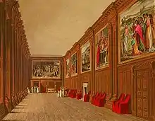 During the Tudor period, the palace was the scene of many historic events. In 1537, the King's much desired male heir, the future Edward VI, was born at the palace and the child's mother, Jane Seymour, died there two weeks later.[21] Four years afterwards, whilst attending Mass in the palace's chapel, the King was informed of the adultery of his fifth wife, Catherine Howard. She was then confined to her room for a few days before being sent to Syon House and then on to the Tower of London. Legend claims she briefly escaped her guards and ran through The Haunted Gallery to beg Henry for her life but she was recaptured.[22]