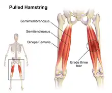A common running injury in several sports, excessive stretch of a hamstring results from extensive hip flexion while the knee is extended.[4][6] During sprinting, a hamstring injury may occur from excessive muscle strain during eccentric contraction late in the leg swing phase.[4][6] The overall incidence of a hamstring injury in sports and professional dancers is about two per 1000 hours of performance.[4] In some sports, a hamstring injury occurs at the incidence of 19% of all sports injuries, and results in an average time loss from competition of 24 days.[4]