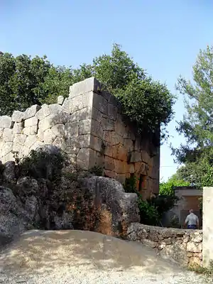 Although the popular name of the ruin is castle, actually it was a 5.3 metres (17 ft)-tall observation tower built in the 6th century.[1] The walls had been built by polygonal masonry technique. There are reliefs of a Dioskuri helmet, a shield, a sword and Herculus' Club on the southern wall.[2]