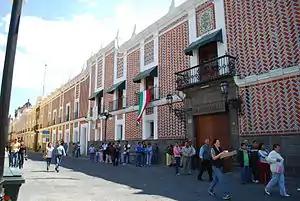 The best known pottery of this type is called Talavera, named after the white background ceramics of Talavera de la Reina, Spain, which it sought to imitate.[1] Like its namesake, Puebla Talavera is characterized by a white background, achieved with tin salts, and mostly blue decorative features using cobalt salts. It has been used to make vases, china, sculpted figures, and tiles. White with blue only as decoration is the most traditional but there are other colors that are accepted as well. The blue decoration of Puebla Talavera is both from east and west. Glazed ceramic was invented in Asia and came to Mexico via Europe, specifically Spain. However, there is also direct Asian influence on the work because of the Oriental goods that came to the country on the Manila Galleon. The use of talavera and other tiles also distinguishes Puebla architecture, being found on facades of major buildings all over the state.[1]
