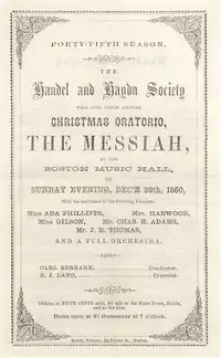 The society joined in celebrations marking the effective date of the Emancipation Proclamation on January 1, 1863.[22] The society marked its golden jubilee in May 1865 with a five-day festival of nine concerts employing a chorus of 700. It included the first H+H performance with full orchestra of Mendelssohn's Hymn of Praise.[29] Five more such festivals using more modest forces followed at three-year intervals.[30][31] Years of preparation led to the first all-but-complete H+H performance of Bach's St. Matthew Passion on May 8, 1874.[32]
