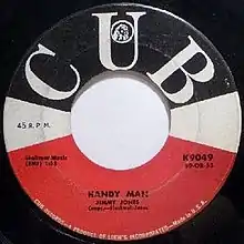 It was originally recorded by The Sparks Of Rhythm, a group Jones had been a member of when he wrote it, although he was not with them when they recorded it. That version was in a minor key, and had a completely different melody. When Jimmy Jones recorded it, the song was changed to a major key, with a completely different melody. In 1959, Jones recorded the song himself, in a version which had been reworked by Blackwell,[2] who also produced the session. In addition, Blackwell also provided the whistling, which is prominently heard throughout the whole song. "Handy Man" became a million seller, reaching No. 3 on the R&B charts and No. 2 on the Billboard Hot 100 in 1960 behind Theme from A Summer Place by Percy Faith.[3]