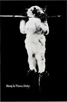 Hang in there, Baby is a popular catchphrase and motivational poster. There were several versions of the "Hang In There, Baby" poster, featuring a picture of a cat or kitten, hanging onto a stick, tree branch, pole or rope. The original poster featured a black and white photograph of a Siamese kitten clinging to a bamboo pole and was first published in late 1971 as a poster by Los Angeles photographer Victor Baldwin. It has since become a popular relic of the 1970s.