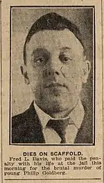 In the hot summer of 1920 near the shores of Lake Ontario, Davis raped and murdered Phillip Goldberg. Davis fled and nearly a year later was found serving time in Auburn State Penitentiary, New York. Davis had late stage syphilis including dementia and hallucinations.[5] Davis was hanged despite being deemed mentally unsound by a physician.