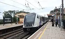 All trains serving Hanwell are operated by TfL Rail, having taken over the Heathrow Connect stopping services between London Paddington and Heathrow Airport, and Great Western Railway local services between London Paddington and Hayes & Harlington from the 20 May 2018 timetable change. From the 17 May 2020 timetable change, Hanwell station gained a Sunday service.[4] The TfL Rail service will be re-branded as the Elizabeth line (part of the Crossrail development) when the line fully opens (projected for mid-2022).[5] This will include direct services from Hanwell to the East via Central London. In November 2021 the Ealing Civic Society recognized the quality of the renovations to the station building by awarding the station the society's annual award.[6][7]