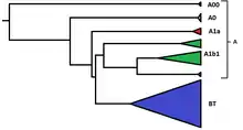 Haplogroup A is a human Y-chromosome DNA haplogroup, which includes all living human Y chromosomes. Bearers of extant sub-clades of haplogroup A are almost exclusively found in Africa (or among descendants of populations which have recently left Africa), in contrast with haplogroup BT, bearers of which participated in the Out of Africa migration of anatomically modern humans. The known branches of haplogroup A are A00, A0, A1a, and A1b1; these branches are only very distantly related, and are not more closely related to each other than they are to haplogroup BT.