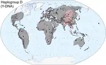 Haplogroup D was formerly the name of the D lineage D-M174. Varying proposals exist regarding the origin of haplogroup DE, the parent of D, with some suggesting an African[2] and others an Asian origin.[3] But D-M174 was, and generally is, assumed to be of Asian origin and is exclusively found in Asia.