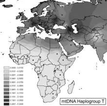 In Africa, haplogroup T is primarily found among Afro-Asiatic-speaking populations, including the basal T* clade.[1] Some non-basal T clades are also commonly found among the Niger-Congo-speaking Serer due to diffusion from the Maghreb, likely with the spread of Islam.[12]