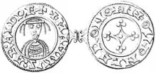 Penny minted by Harald, with a triquetra on the obverse, used both by Christians and in Norse paganism.[67] It was used on coins in Denmark by Cnut the Great and his sons,[lower-alpha 2] and Harald probably adopted it as part of his claim to the Danish throne.[84][85]