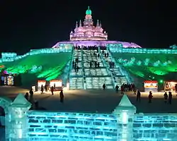 The Harbin International Ice and Snow festival (Chinese: 哈尔滨国际冰雪节; pinyin: Hā'ěrbīn Guójì Bīngxuě Jié) is an annual winter festival that takes place with a theme in Harbin, Heilongjiang, China, and now is the largest ice and snow festival in the world. At first participants in the festival were mainly Chinese, however it has since become an international festival and competition, with the 2018 festival attracting 18 million visitors and generating 28.7 billion yuan ($4.4 billion) of revenue.[1] The festival includes the world's biggest ice sculptures.[2]