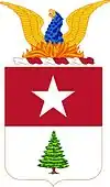 The star has a dual significance. Its five points represent the five forts in the Coast Defenses; in addition it represents the Pole Star, those being the most northerly defenses in the country. It is set on a field of artillery red. The pine tree is the emblem of Maine, and is on a white field symbolic of the snows among which this particular pine (Pinus Rigidus) grows. The motto translates to "We Defend the Land Gate." "Terrae Portam" is also the Latin equivalent for Portland and "Defendamus" is the motto of the Coast Artillery Corps.[2][42]