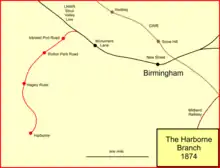 In 1866 Harborne was a distinct community outside Birmingham, with a population of over 22,000.[1] The Harborne Railway was planned to serve certain suburbs of Birmingham, bringing in business people from the well-to-do areas of Lapal (near Halesowen) and Harborne. However, there was major opposition to the Lapal end of the scheme, and the promoters cut back their scheme to a route of just under 2+1⁄2 miles. The Harborne Railway Company got its Act of Parliament on 28 June 1866. Authorised capital was £100,000.[1][2][3]