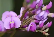 Hardenbergia violacea is a prostrate or climbing sub-shrub with wiry stems up to 2 m (6 ft 7 in) or more long. The leaves are egg-shaped to lance-shaped, 30–100 mm (1.2–3.9 in) long and 10–50 mm (0.39–1.97 in) wide on a petiole about 10 mm (0.39 in) long. The leaves are leathery, glabrous and paler on the lower surface. The flowers are arranged in racemes of between twenty and forty flowers, each on a pedicel mostly 2–4 mm (0.079–0.157 in) long. The sepals are 3–4 mm (0.12–0.16 in) long and joined at the base, forming a bell-shaped tube with triangular teeth. The petals are about 8 mm (0.31 in) long, mostly purple, the standard petal with a yellowish spot and a notch on the summit, the wings are egg-shaped with the narrower end towards the base and the keel is curved. Flowering mostly occurs from August to November and the fruit is a pod 20–45 mm (0.79–1.77 in) long containing between six and eight kidney-shaped seeds. The flowers are usually purple or violet, but pink, white and other colours sometimes occur.[2][5][6][7][8][9]