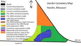 Hardin and its cemetery were affected by the Great Flood of 1993, due to their location near the Missouri River. On July 12, 1993 a levee protecting the town of Hardin broke, flooding the city and the cemetery. The flood waters cut a pond thru the cemetery and swept away 793 burials. Later, 645 remains were recovered, but most were unidentified. Some were still inside their vaults or caskets (thus helping making identification easier), while others were scattered in the open. Since DNA testing was still in its infancy, bodies and bones had to be identified by the rate of decay, sex, age range, dental records and family recollections. Of the bodies recovered, only 120 were identified and reburied with their original headstones. The remaining 525 bodies were unidentified. Some had decayed to the point that they were unrecognizable, others were too old to have any surviving records or relatives. The unidentified bodies were reburied in a mass grave in part of a 9.5 acre plot of land that was purchased by the cemetery after the 1993 flood. The unidentified were marked with a headstone listing them as unknown and a number, so in case the bodies were to be disturbed again by another flood or if authorities wanted to try to identify them with newer technology or DNA testing in the future. A memorial was added to the western entrance of the cemetery in 1994 to honor the 1993 flood and the unidentified bodies. Part of the newly acquired acre of land was also used to display the recovered headstones of those whose bodies were not identified. They today function as a Cenotaph for the unidentified bodies so living family members can still pay respects. The rest was used to rebury the 120 identified bodies and for new burials. In 1995, a second memorial was added near the mass grave displaying the names, birth and death years of the displaced bodies that could not be identified. Today, the cemetery is 18.5 acres large, including the pond.[9][10][11]