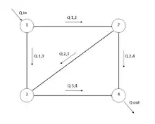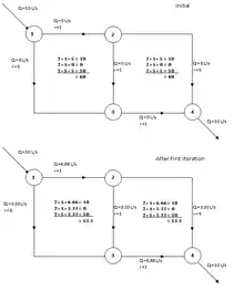 The Hardy Cross method is an application of continuity of flow and continuity of potential to iteratively solve for flows in a pipe network.[1] In the case of pipe flow, conservation of flow means that the flow in is equal to the flow out at each junction in the pipe. Conservation of potential means that the total directional head loss along any loop in the system is zero (assuming that a head loss counted against the flow is actually a head gain).
