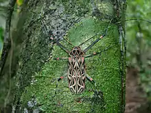 The harlequin beetle (Acrocinus longimanus) is a tropical longhorn beetle native from southern Mexico to Uruguay.[1] The harlequin beetle feeds on sap and is given this name because of its elaborate pattern of black, red and greenish yellow markings on the wing covers of both sexes.[2] The species name longimanus is a Latin word that refers to the extremely long forelegs (manus) of the males, which are usually longer than the beetle’s entire body. As an adult, the species is very large, with a body that can measure nearly 76 mm (3 inches) in length.[3] It is also famous for carrying pseudoscorpions as a form of phoresy.
