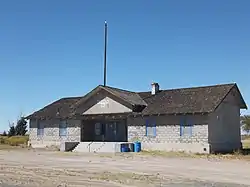 The Harmon School building is a coursed concrete block structure which was built in 1915 to serve rural Nevada’s Harmon District. The balanced, 5-bay building is supported through a raised, concrete foundation and ends in a cross gable roof with projecting eaves and open rafters. 2 internal brick chimneys with straight stacks and corbelled caps punctuate the main roof plane. The building is exposed to the south and takes up a "T" plan fashioned by a center hall, flanking classrooms and a rear auditorium. A halfway basement is found underneath the auditorium and it also has a kitchen. In 1935, the area of the back auditorium was expanded by a 2-bay frame and stucco addition.[1]