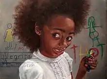 Harmonia Rosales (born 1984) is an Afro-Cuban American artist from Chicago.[1][2][3] She works mostly as a classical painter depicting women and people of color assuming roles of power and beauty in exquisite imaginings of ancient myths, Afro-Cuban culture, and Renaissance paintings. Her style is detailed renderings involving oil paint, raw linens, gold leaf, and wood panels. Since 2017, her work has used iron oxide to portray not only African soil but the decay in African history in America, a choice she intended to amplify the question “Why? Why have we accepted Eurocentric perceptions of beauty and historical narratives for so long?”